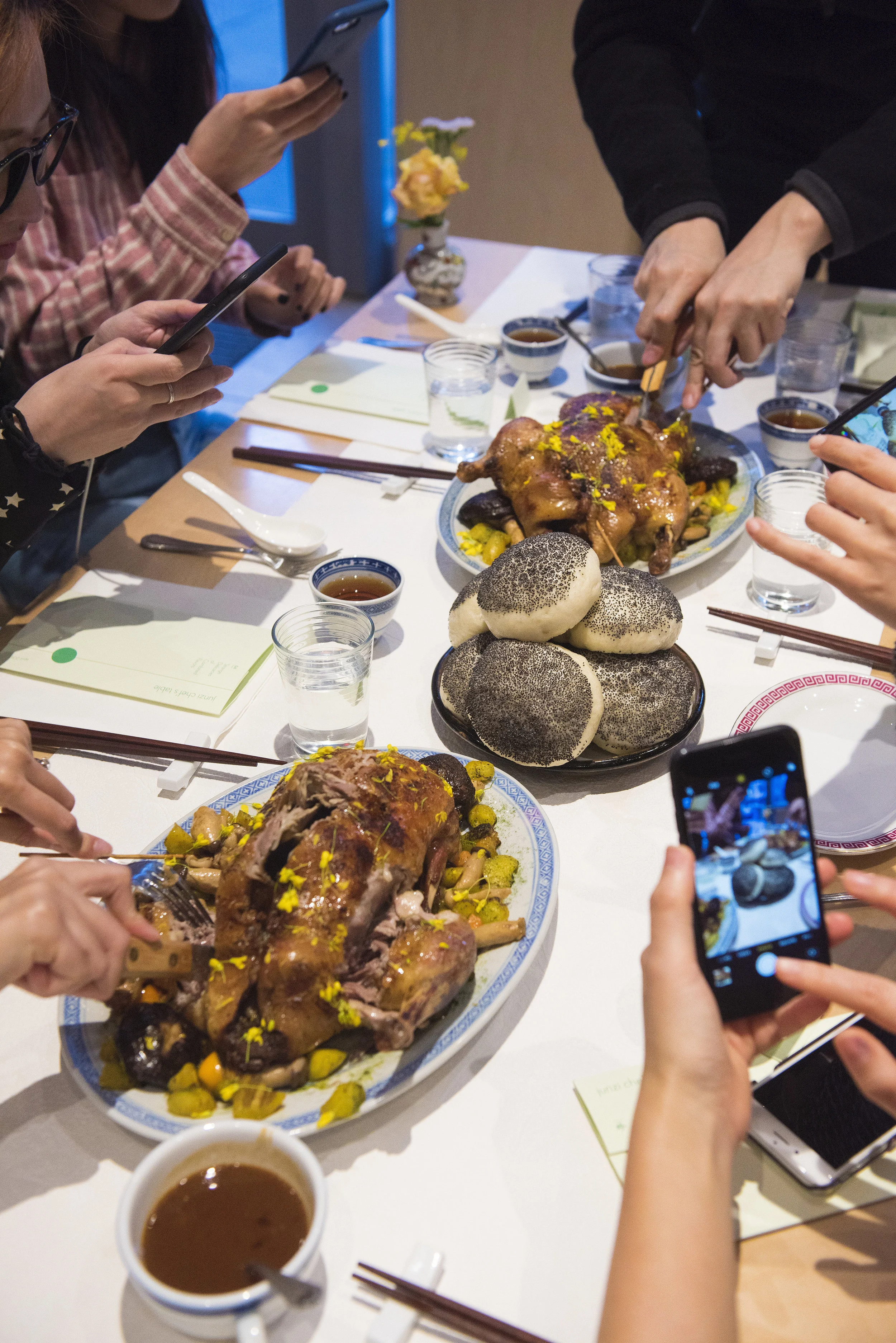 Family-style 2nd course: Roasted duck and fluffy poppy seed bao with lamb gravy, to soak up all that flavor.