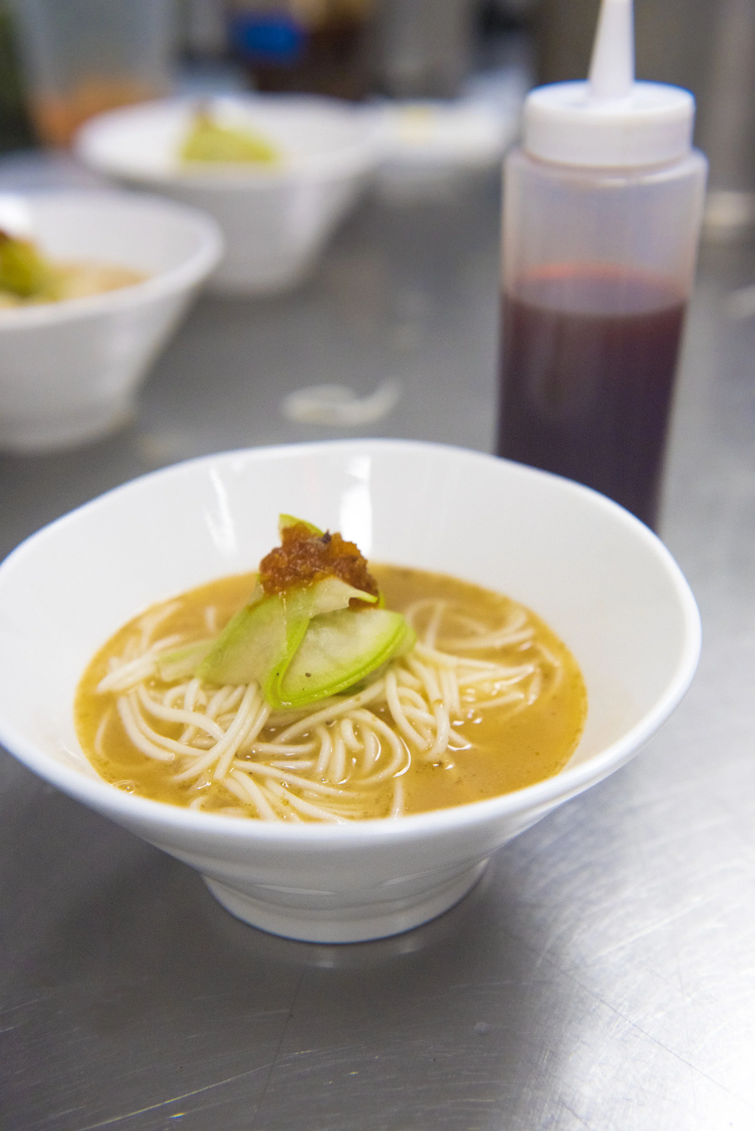 The 4th course: hanging noodles in duck and mutton broth with sweet melon, plus a touch of red vinegar